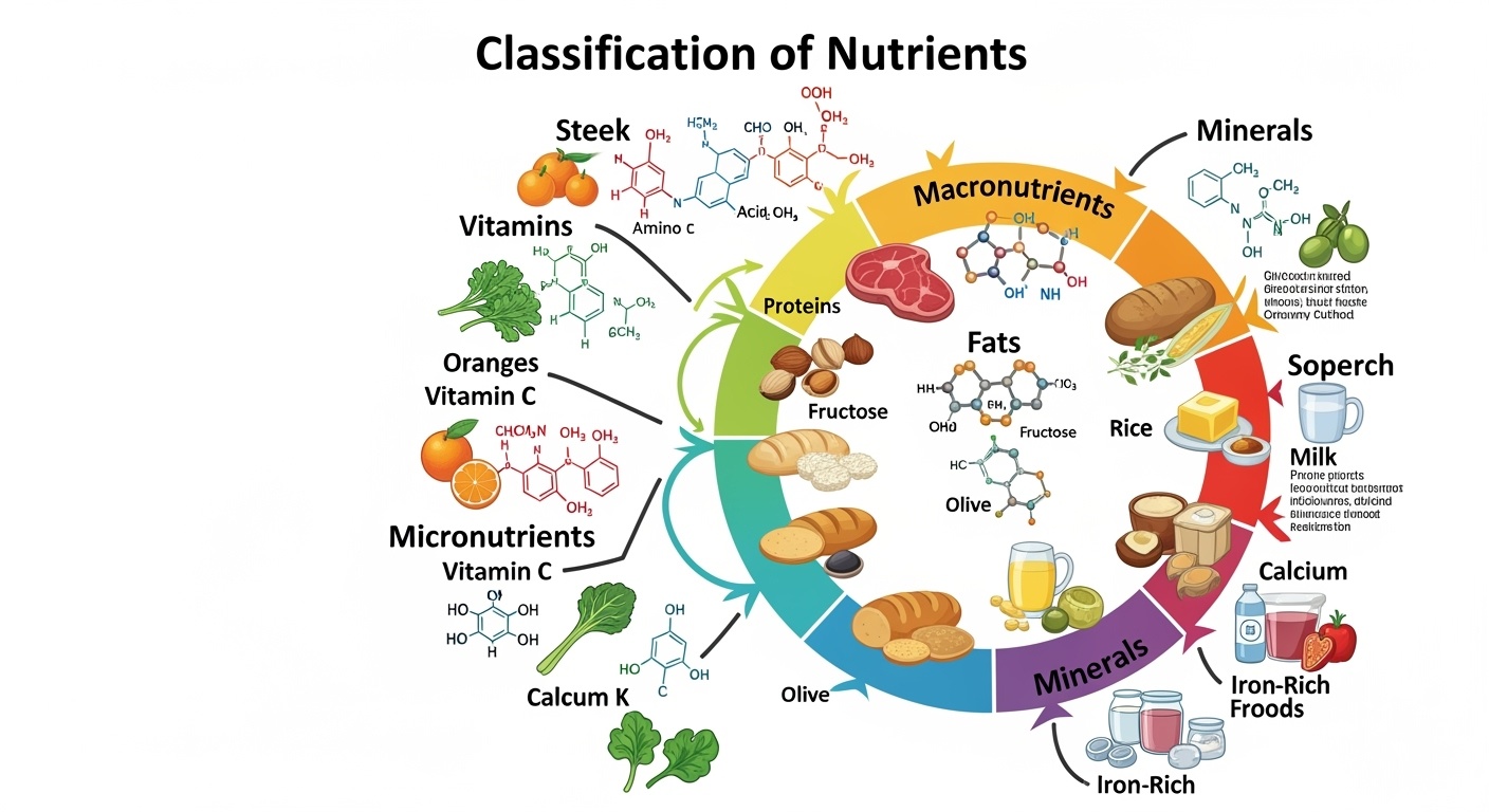 Nutrients are chemical substances found in food that are essential for growth, maintenance, and repair of body tissues. The human body requires approximately 50 different nutrients to function optimally, each playing specific roles in physiological processes. These nutrients can be classified in multiple ways, each classification system serving different clinical and educational purposes.